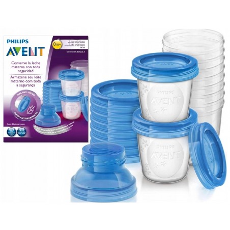 Zestaw składa się z 10 pojemników na pokarm wielokrotnego użytku o pojemności 180 ml. i 2 adapterów.