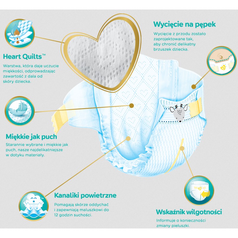 Pieluszki Pampers Premium Care przeznaczone dla dzieci o wadze ciała 2-5kg zapewnią maluszkowi długotrwałą suchość i komfort już od pierwszych chwil życia.