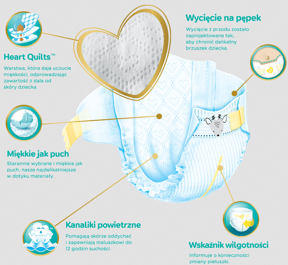 - Wyselekcjonowane, miękkie jak puch materiały od Pampers dla najdelikatniejszej skóry dziecka (produkt nie zawiera piór).