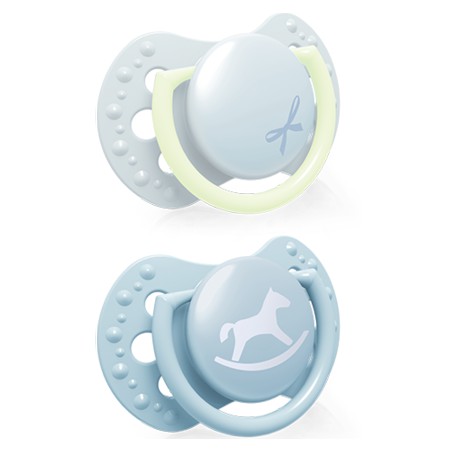 Smoczek dynamiczny LOVI 0-2 m Baby Shower Boy dedykowany dla maluszków od urodzenia do 2 miesiąca życia. Posiada znacznie mniejszą i lżejszą tarczkę niż standardowe smoczki uspokajające LOVI. Uchwyt jednego ze smoczków w zestawie świeci w ciemności, więc łatwo odnaleźć go w nocy.