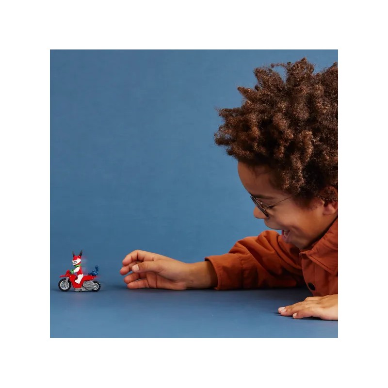 Zestaw z motocyklem kaskaderskim zawiera łatwe instrukcje z obrazkami, dzięki którym dzieci mogą samodzielnie złożyć własną zabawkę LEGO albo zaprosić do zabawy w budowanie przyjaciół i członków rodziny.