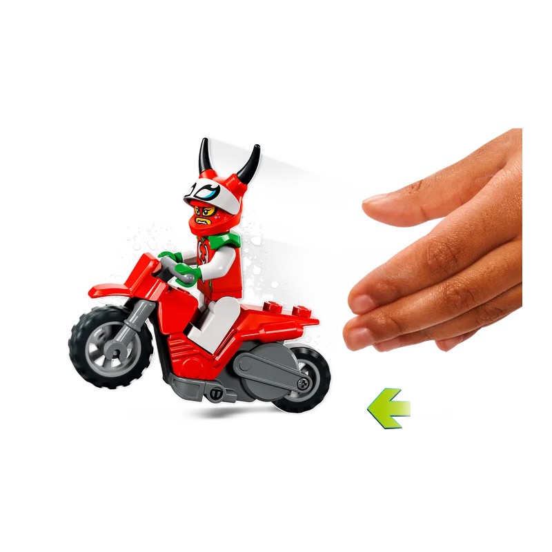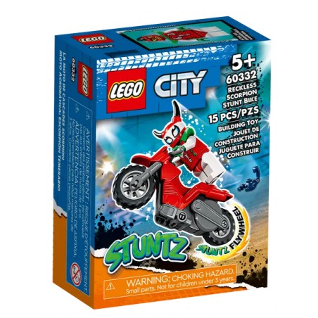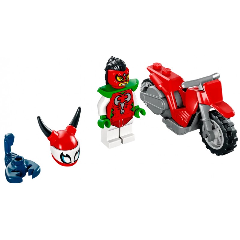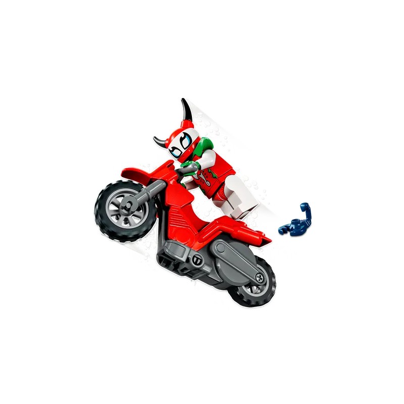 Zestaw LEGO City Motocykl kaskaderski brawurowego skorpiona (60332) zapewni dzieciom niezapomnianą zabawę. W środku znajdziesz fajny motocykl napędzany kołem zamachowym, postać LEGO City Stuntz Skorpiona Luchadorę oraz figurkę jej zaprzyjaźnionego małego skorpiona. Ten jadowity duet zachwyci każdą publiczność!