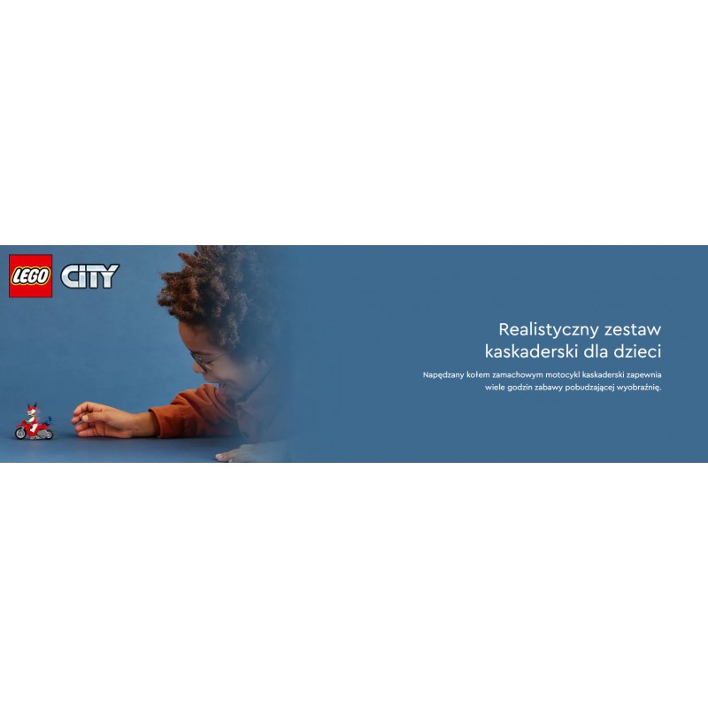 - Zbierz i połącz — motocykl można połączyć z innymi zestawami z serii LEGO City Stuntz, by urozmaicić zabawę w pokazy kaskaderskie