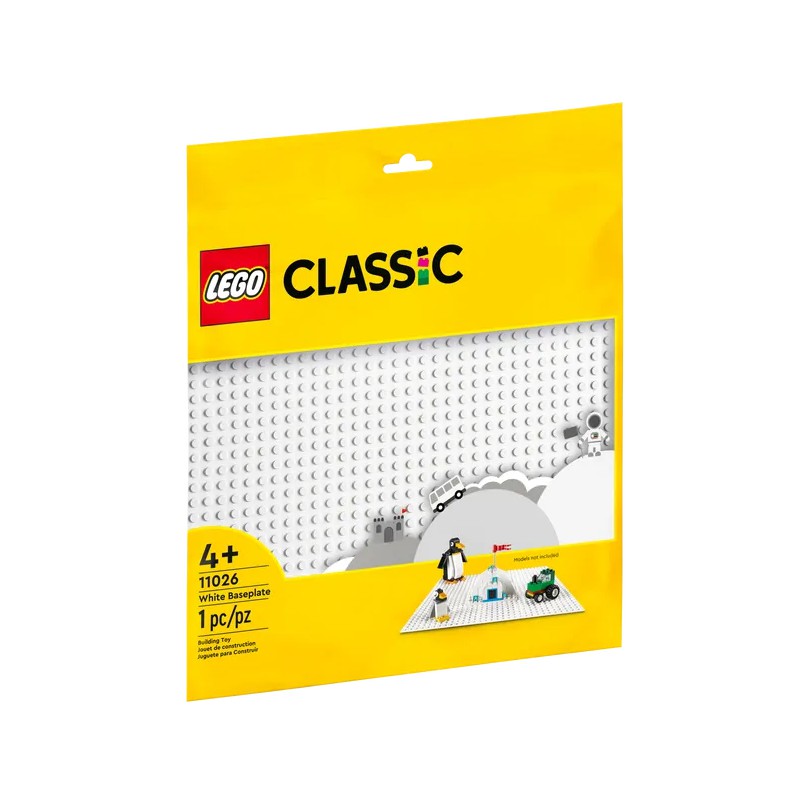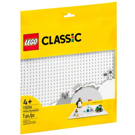 Duża biała zabawka konstrukcyjna LEGO o wymiarach 25 cm × 25 cm z wypustkami w układzie 32 × 32 stanowi podstawę, na której dzieci mogą tworzyć krajobrazy, budować swoje zabawki, bawić się nimi i je eksponować.