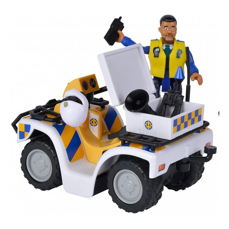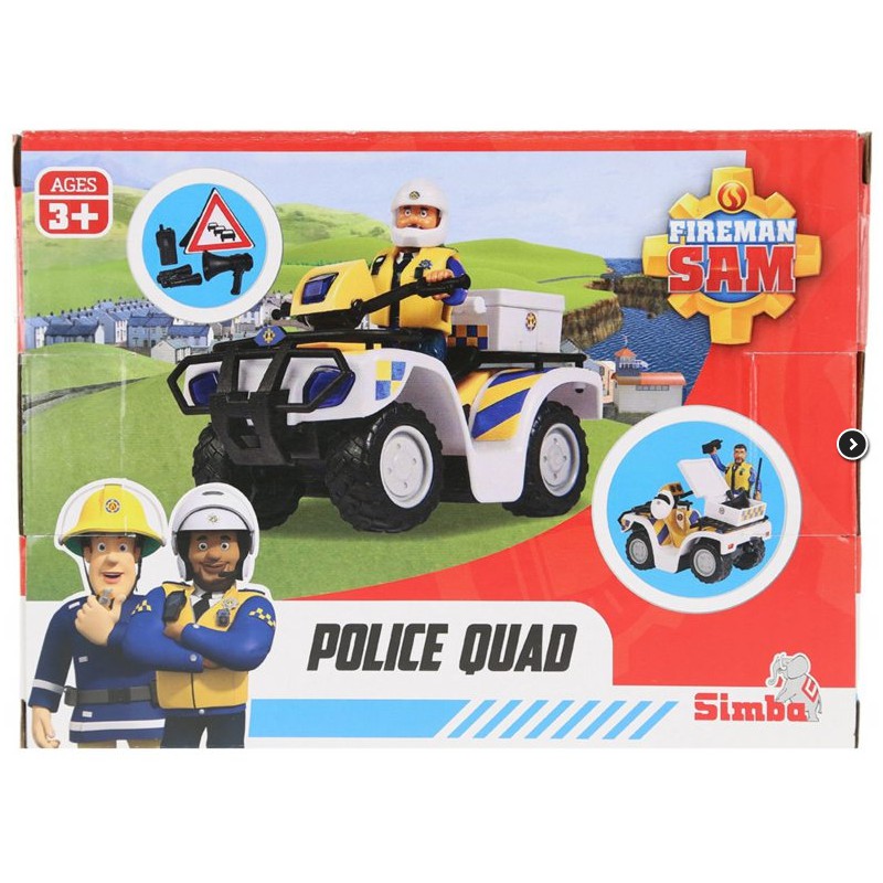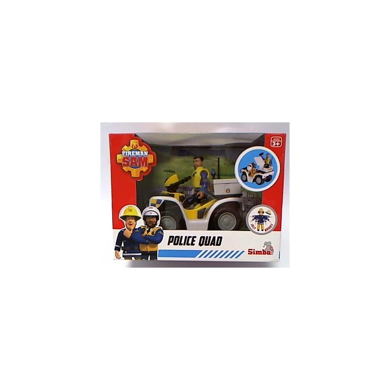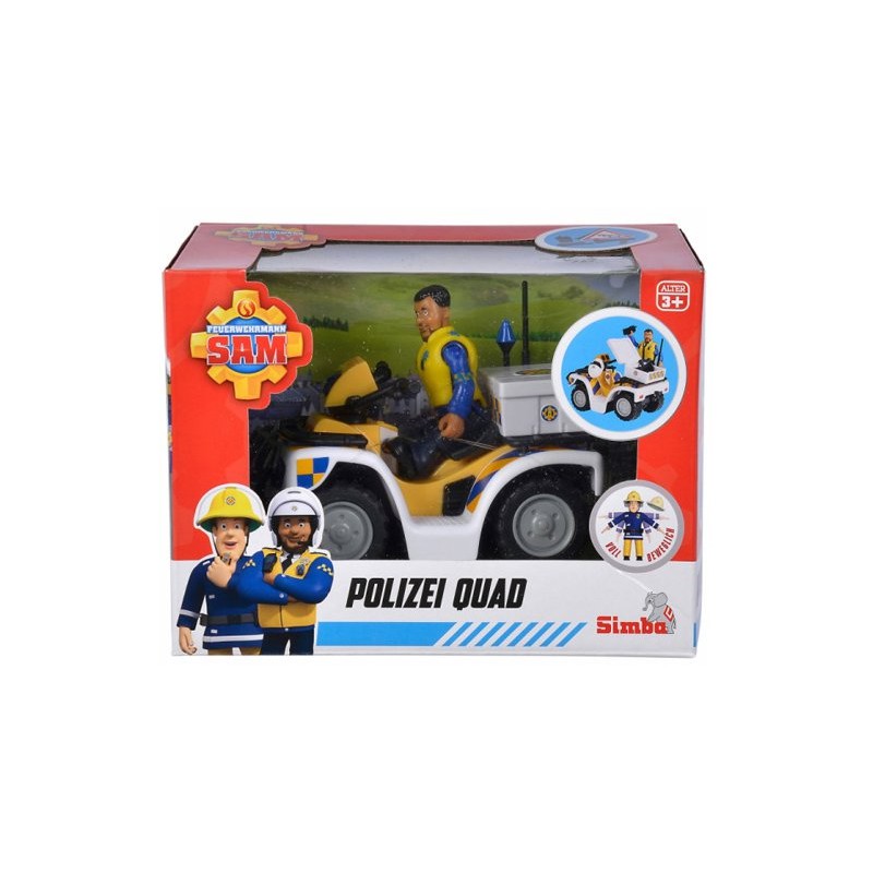 Zestaw dla miłośników bajki o dzielnym strażaku Samie. Nieustraszony Strażak Sam i jego drużyna znowu ruszają do akcji! W miasteczku Pontypandy pojawia się nowa postać – policjant Malcolm Williams. On i strażacy wezmą udział w wielu wspólnych akcjach ratunkowych. Malcolm, jak na policjanta przystało, będzie też tropił przestępców, którzy zakłócą spokój mieszkańców. Policjant Malcolm może błyskawicznie odpowiedzieć na wezwanie swoim policyjnym quadem! Biały quad z niebiesko-żółtymi refleksami posiada otwieraną skrzynkę na narzędzia. W zestawie występuje także figurka policjanta z ruchomymi kończynami.