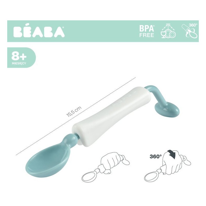 Ergonomiczna łyżeczka treningowa 360° francuskiej marki BEABA ułatwia naukę samodzielnego jedzenia. Jej główka obraca się, a dzięki odważnikowi na końcu, pozostaje zawsze we właściwej pozycji, dzięki czemu nic się z niej nie wylewa, nawet jeśli dziecko nie potrafi jeszcze trzymać prawidłowo sztućców. Na kolejnym etapie nauki jedzenia, obrotowy uchwyt można zablokować tak, aby spełniała funkcję normalnej łyżeczki. Łyżeczka jest na tyle głęboka, że nadaje się do jedzenia gęstych płynów, zup czy puree. Wykonana z najwyższej jakości materiału, wolnego od BPA. Jej elementy można rozdzielić, co sprawia, że łatwo ją wyczyścić.