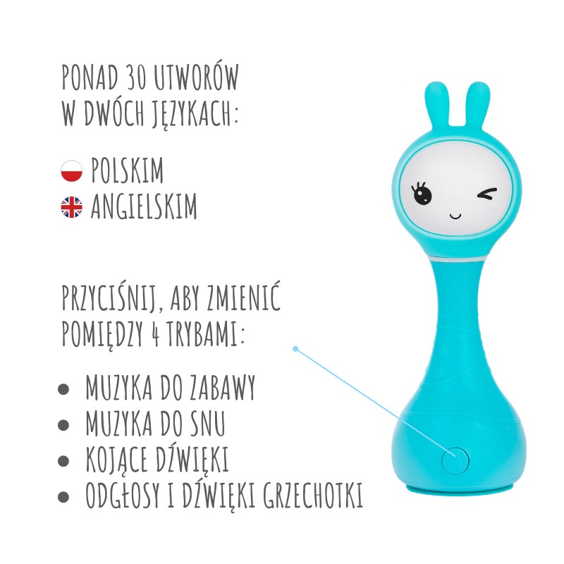 Poznaj Alilo Smarty Bunny – inteligentną elektroniczną grzechotkę z odtwarzaczem muzyki i identyfikatorem kolorów.