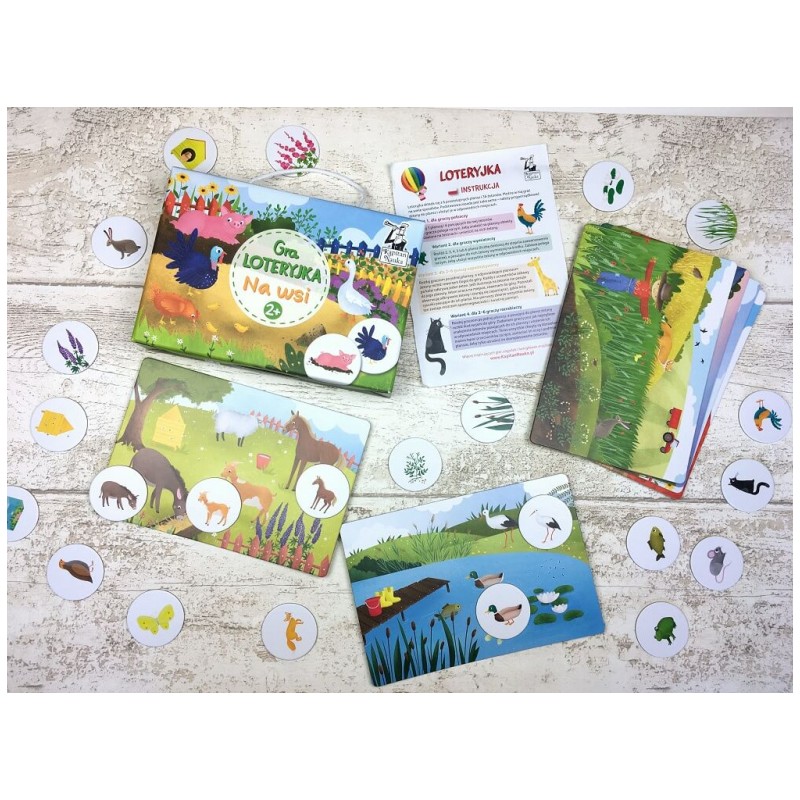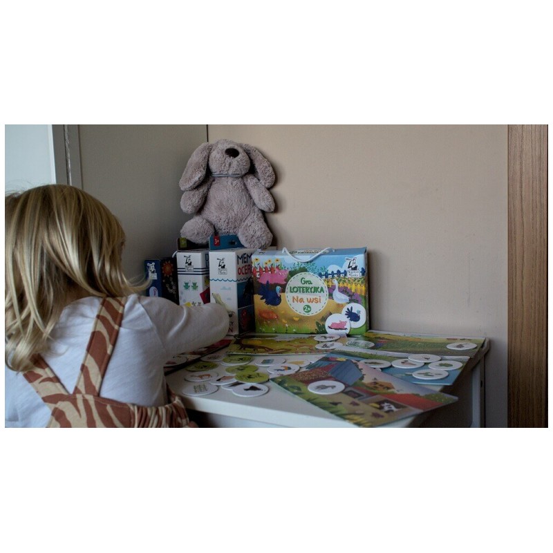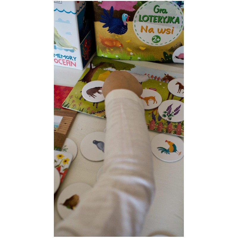 Gra Loteryjka. Na wsi to idealny wybór dla najmłodszych dzieci, na rozpoczęcie przygody z grami. Proste zasady i angażujące zadania pozwolą poćwiczyć pamięć, koncentrację i spostrzegawczość. Poszukiwanie i przyporządkowywanie żetonów do odpowiednich pól na planszy, zaangażuje dziecko i połączy zabawę z treningiem umiejętności.