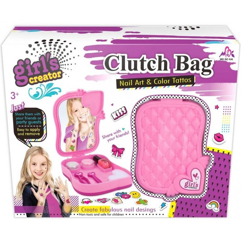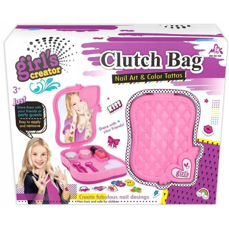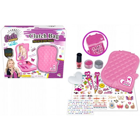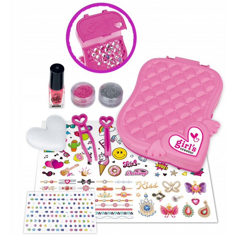 Zestaw do zdobienia paznokci oraz tatuaże od Askato w zestawie z pudełkiem do przechowywania z lusterkiem, lakierem do paznokci, brokatem, pęsetą, gąbeczką, naklejkami na paznokcie oraz tatuażami.