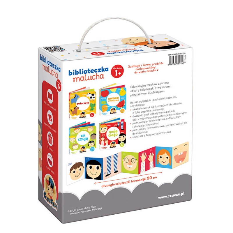 Edukacyjny zestaw książeczek porusza tematykę bliską najmłodszym. W środku znajdziecie 4 tytuły: Co czuję, Owoce i warzywa, Moje ciało i Zwierzęta. Pełne uroku ilustracje przedstawiają to, co maluchy lubią i znają z najbliższego otoczenia. Zachęcają do wspólnej lektury i zabawy oraz pokazują, że czytanie to doskonały i rozwijający sposób na spędzanie czasu.