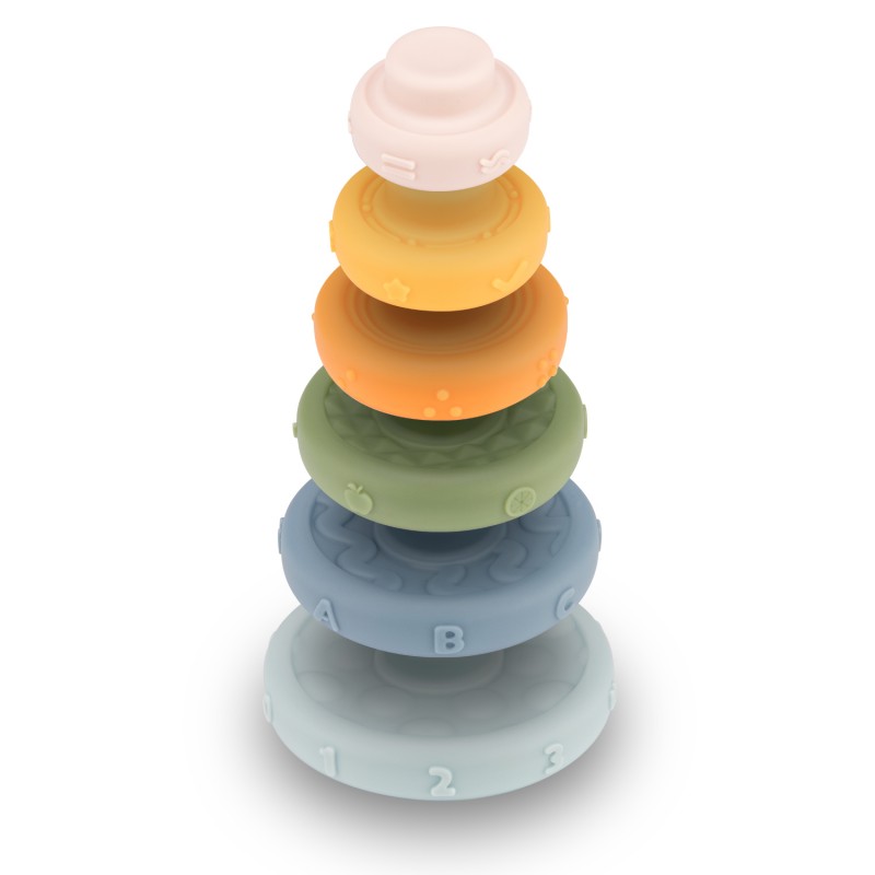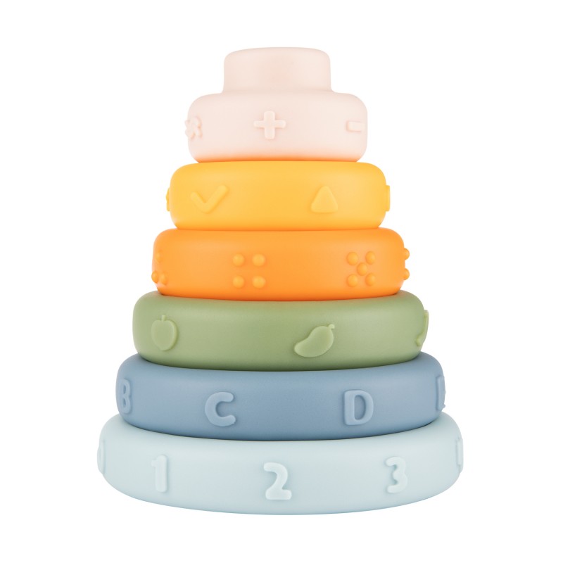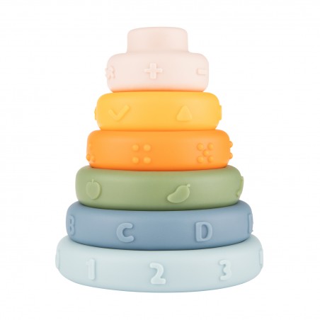Sensoryczna zabawka układanka Canpol babies piramidka składa się z 6 elementów o różnych wielkościach i kolorach. Układanie kolorowych elementów jeden na drugim od największego do najmniejszego w kształt piramidy ćwiczy zręczność i cierpliwość dziecka. Piramidka pomaga w nauce rozróżniania kolorów i wielkości, wspiera koordynację oko-ręka u dziecka. Każda warstwa piramidy ma wypustki o różnych kształtach – cyfry, literki, kropki itp., dzięki czemu Maluszek może dotykać je paluszkami poznając nowe faktury aktywizując zmysł dotyku lub „smakować” – poszczególne elementy świetnie sprawdzą się jako gryzaki. To klasyczna zabawka edukacyjna, dzięki której dziecko poprzez zabawę ćwiczy zdolności manualne, pamięć oraz wyobraźnię, a także logiczne i strategiczne myślenie – jak z porozrzucanych elementów ułożyć wieżę. Układanie sensorycznej piramidki to wspaniała wciągająca zabawa dla Maluszków.