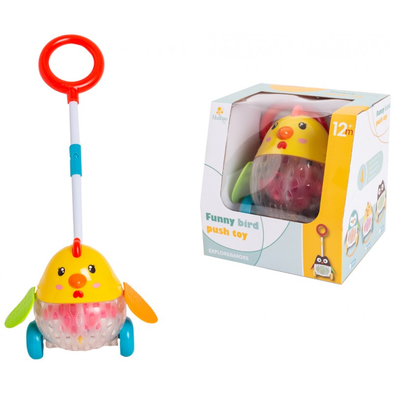 Pchacz kurczaczek ze światełkami. Podczas pchania kurczak rusza skrzydełkami i migoczą kolorowe światełka.