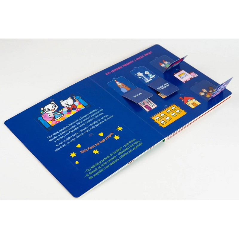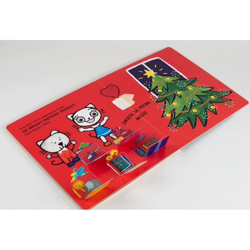 Kicia Kocia i Nunuś. Idą święta” jest kolejną pozycją, dzięki której mali czytelnicy mogą odkrywać przygody Kici Koci oraz jej braciszka. Tajemnice ukryte w 45 otwieranych okienkach spowodują, że czas z książeczką będzie dla najmłodszych wspaniałą zabawą. Dodatkowo dzieci zapoznają się z bożonarodzeniowymi tradycjami, takimi jak ubieranie choinki czy pieczenie pierniczków!