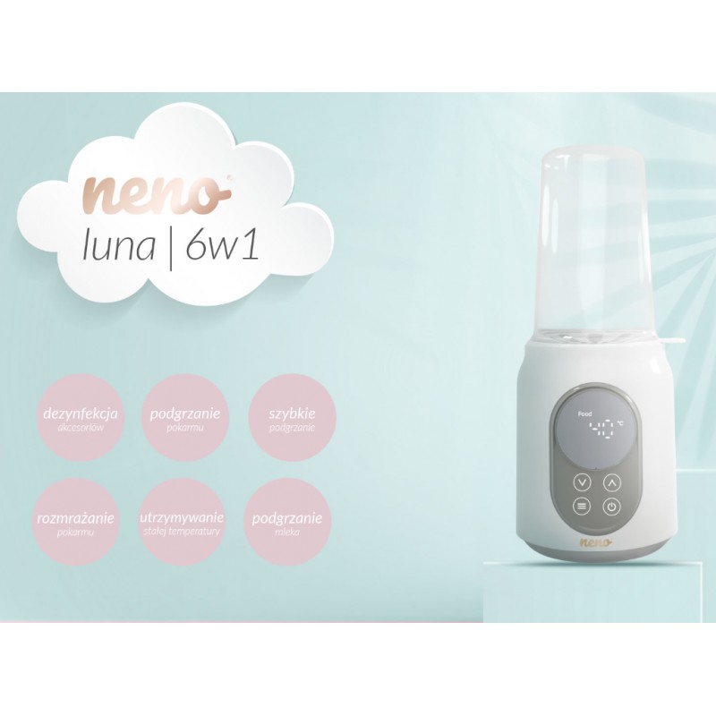 SZYBKA STERYLIZACJA- Z intuicyjnym sterylizatorem Neno Luna w 10 minut zdezynfekujesz butelki, gryzaki, smoczki i części zamienne do laktatora. To Twój “must-have”, jeśli zależy Ci na właściwej higienie i ochronie przed wszelkimi drobnoustrojami, wirusami i bakteriami. Urządzenie odpowiada na potrzeby świadomych mam, które dbają O bezpieczeństwo, higienę i sterylność.
