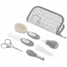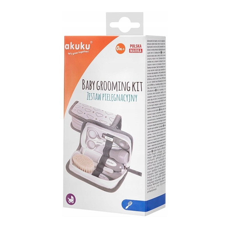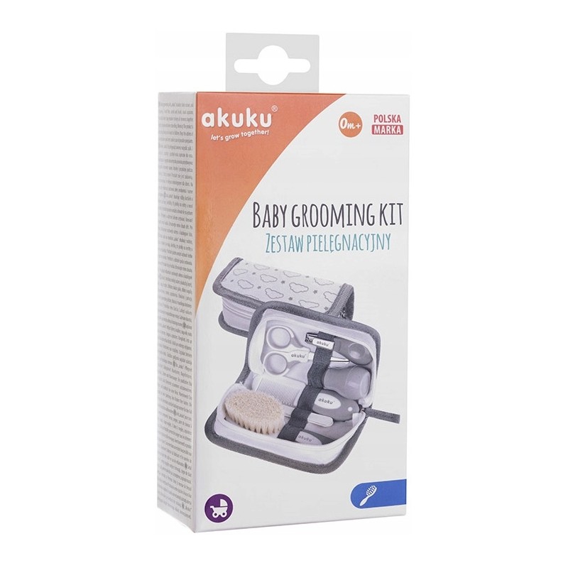 Zestaw niezbędnych akcesoriów do higieny i pielęgnacji niemowląt w skład którego wchodzą: nożyczki, cążki, pilniczek, szczotka, grzebyk do włosów oraz gruszka do nosa. Zestaw w praktycznej i wygodnej kosmetyczce na zamek.