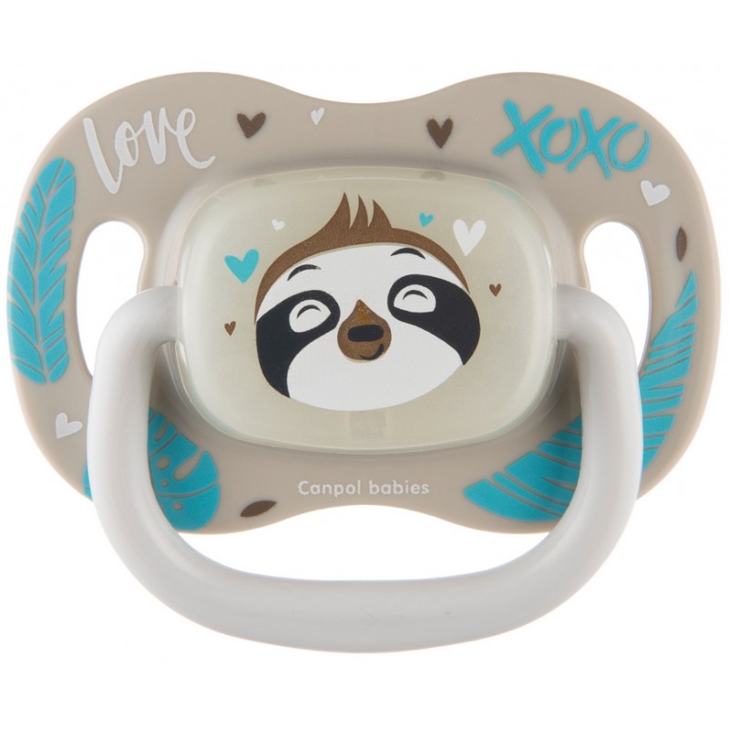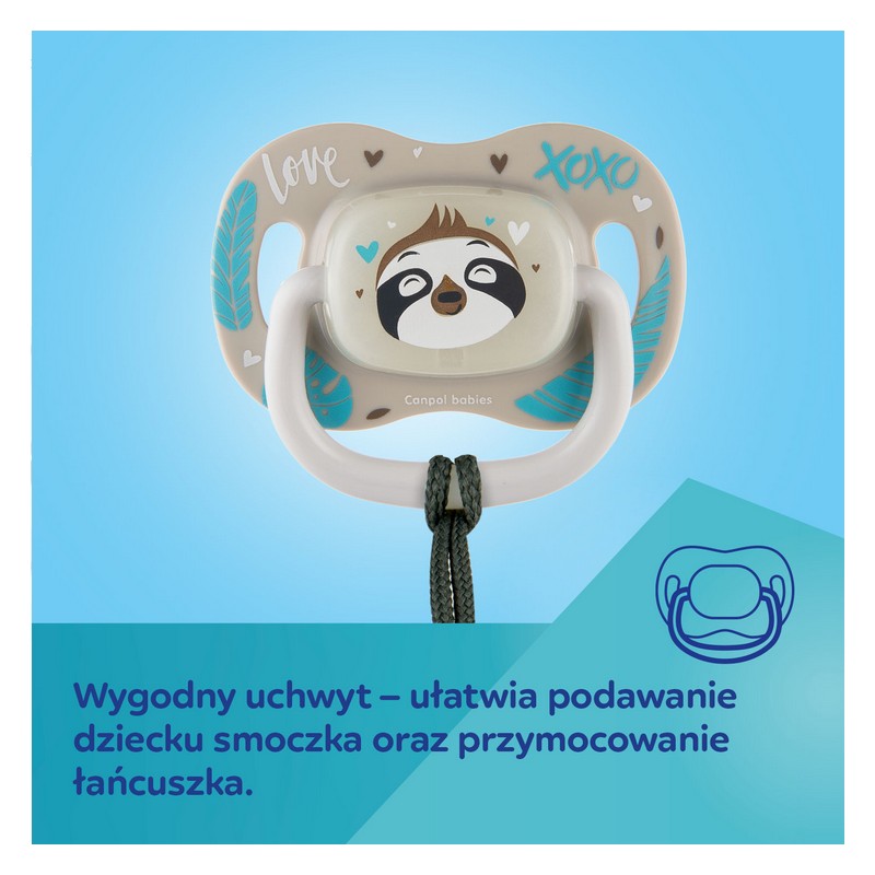 Smoczek uspokajający Exotic Animals zrelaksuje i wyciszy Maluszka. Gumka o symetrycznym kształcie została wykonana z najwyższej jakości, bezpiecznego i delikatnego silikonu, bezzapachowego i bezsmakowego, co ułatwia akceptację smoczka przez dziecko. Otwory wentylacyjne w tarcze zapewniają swobodne oddychanie i połykanie śliny. Specjalnie zaprojektowany kształt tarczki, minimalizuje odciskanie się smoczka na delikatnej buzi dziecka, zapobiegając podrażnieniom. Wygodny uchwyt smoczka pozwala na przymocowanie łańcuszka i ułatwia podanie go dziecku. Świecący w ciemności dysk smoczka ułatwia odnalezienie smoczka nocą. Smoczek symetryczny Canpol babies 18m+ EXOTIC (leniwiec) jest trwały i odporny na odkształcenia. Nie zawiera BPA. Smoczek silikonowy Canpol babies symetryczny 18m+ EXOTIC (leniwiec) jest bezpieczny i łatwy do utrzymania w czystości – można dezynfekować we wrzącej wodzie oraz w sterylizatorze. Smoczek symetryczny dobrze dopasowuje się do buzi dziecka niezależnie od sposobu umieszczenia, a jego kształt uważany jest za najbardziej fizjologiczny i wspierający utrzymanie naturalnego rytmu ssania oraz prawidłowego rozwoju mowy. Smoczek rekomendowany dla dzieci w wieku 18 miesięcy.
