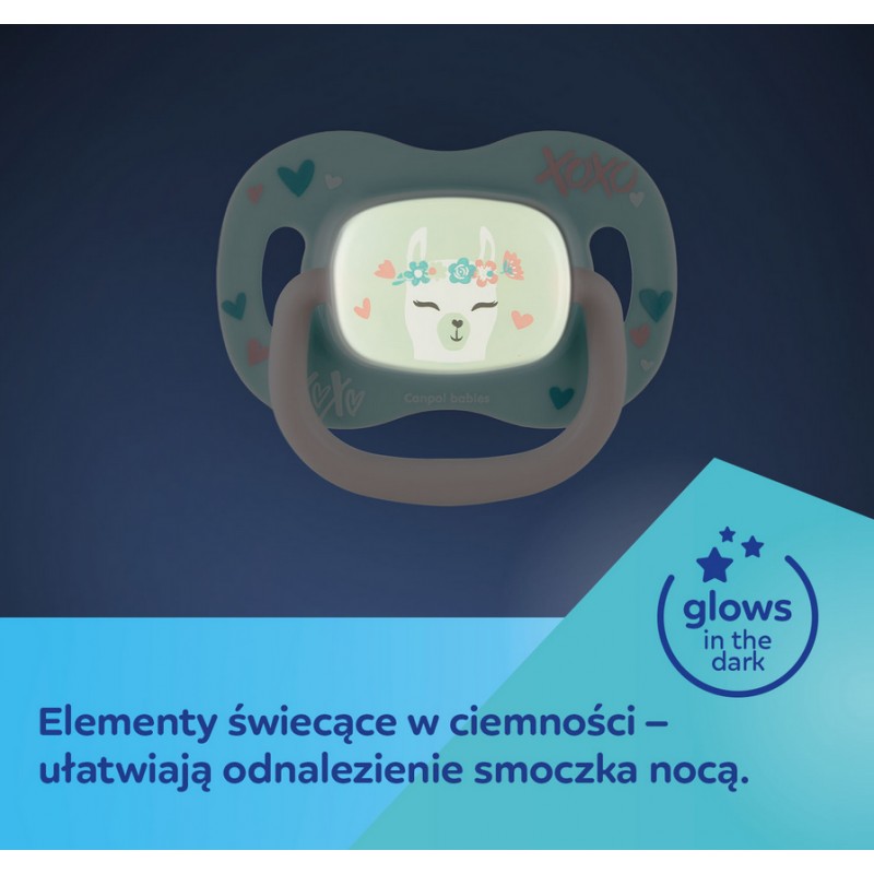 - Elementy świecące w ciemności – ułatwiają odnalezienie smoczka nocą.