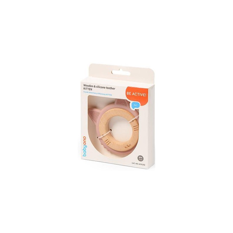 Gryzak KITTEN Babyono wykonany z bezpiecznego silikonu i drewna bukowego z wypustkami zapewni maluszkowi zróżnicowane wrażenia sensoryczne.
