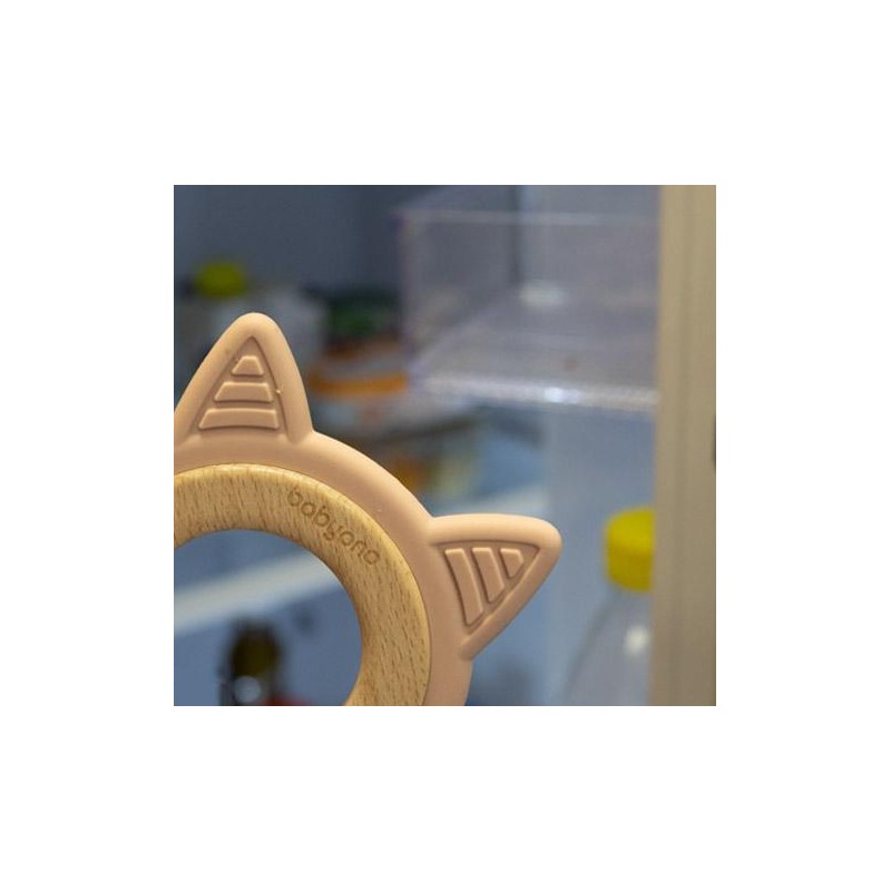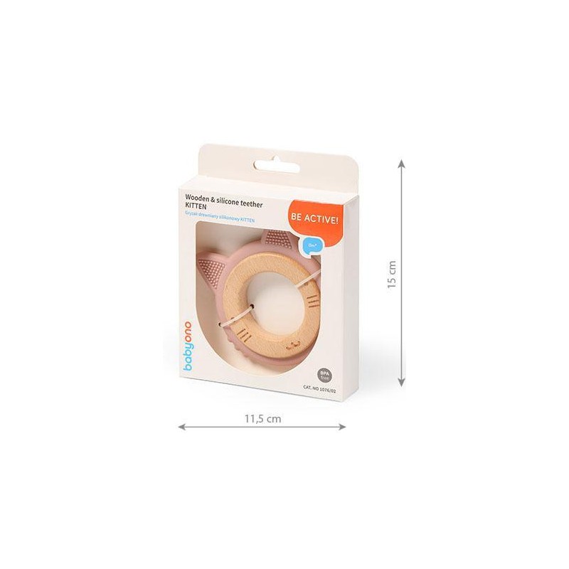 Gryzak drewniany-silikonowy Babyono KITTEN przystosowany do nieco większej rączki lub po prostu preferencji dziecka. Łagodzi ból dziąseł dzięki bezpiecznemu silikonowi mającemu masujące wypustki. Zastosowanie dodatkowo żelu na ząbkowanie złagodzi obrzęk dziąseł, a drewniany element wprowadzi dziecku dodatkowe wrażenia sensoryczne. Nie bez znaczenia jest również motyw kotka.
