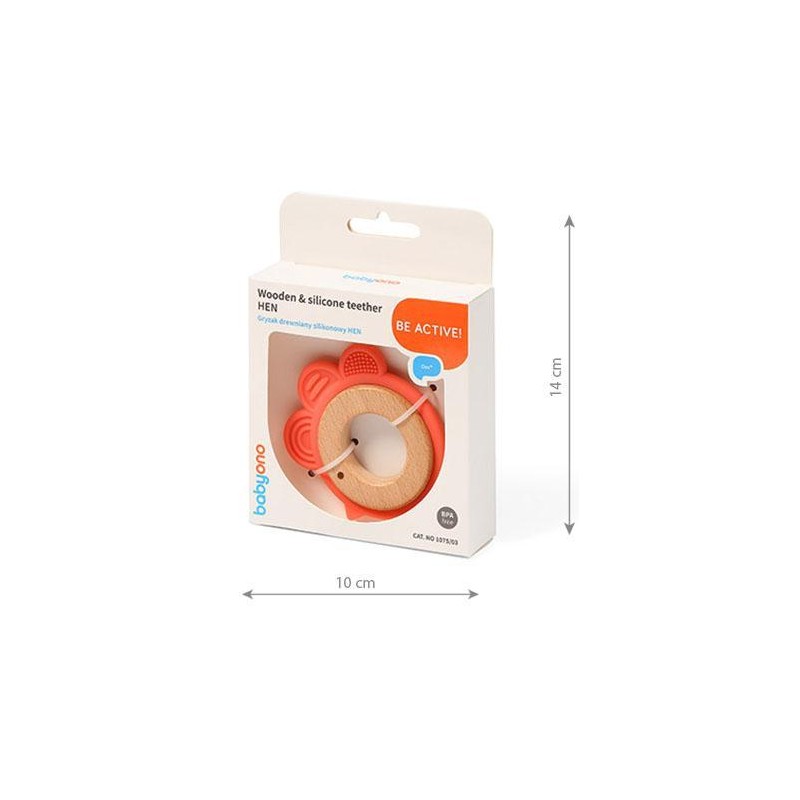 Poręczny i miękki. Gryzak drewniano-silikonowy Babyono HEN jest stworzony z myślą o tym, aby łatwiej się go chwytało małymi rączkami.