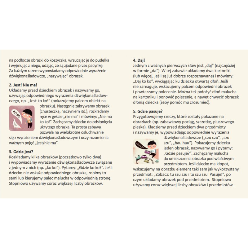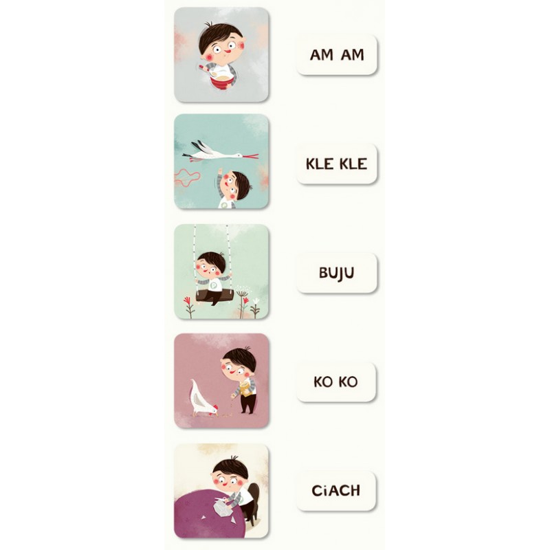 Wyrażenia dźwiękonaśladowcze są wypowiadane już przez roczne dzieci i stanowią bardzo istotny element rozwoju mowy. Zebrane w estetycznym pudełku obrazki dają okazję do rozmaitych zabaw, w zależności od możliwości intelektualnych i potrzeb dziecka: nauki nazywania obiektów, powtarzania i rozpoznawania wyrażeń dźwiękonaśladowczych, wyszukiwania wskazanych przez rodziców obiektów spośród kilku wybranych kartoników i wielu innych gier (opisanych w dołączonej do zestawu instrukcji). Zabawka może także stanowić pomoc w stawianiu pierwszych kroków w nauce czytania.