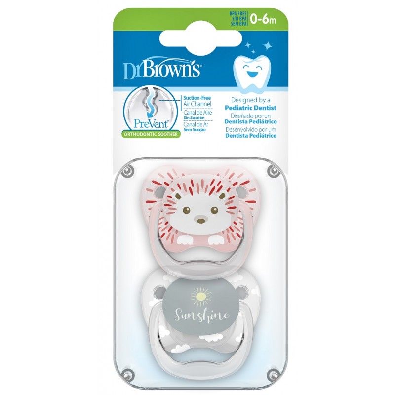 Smoczki uspokajające PreVent z najnowszej kolekcji DR BROWN'S opatentowane i zaprojektowane przez dziecięcego stomatologa to najlepszy wybór smoczka uspokajającego dla maluszka. Anatomiczny kształt oraz zastosowanie kanalika odpowietrzającego co korzystnie wpływa na rozwój jamy ustnej dziecka.