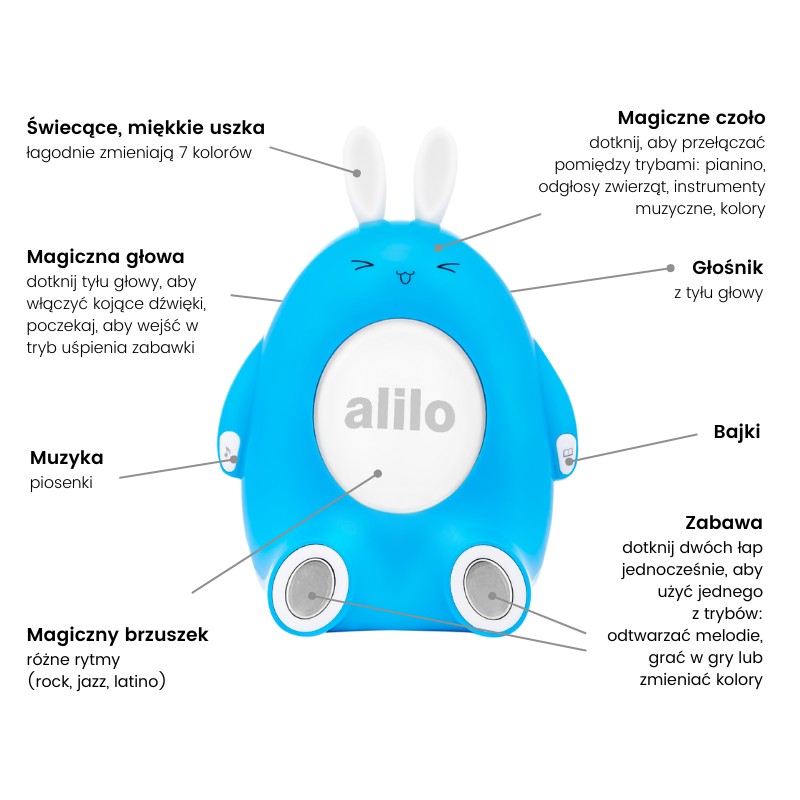 Gwarantuje świetną zabawę ze świecącym brzuszkiem i uszkami. Podobnie jak reszta rodziny króliczków Alilo opowiada bajki i śpiewa piosenki. Można z nim również zagrać w gry! Jego ciało reaguje na dotyk – po dotknięciu łapek, brzucha lub głowy odtwarza rytmy, dźwięki bębnów i pianina, uczy odgłosów zwierząt i kolorów. Dzięki wielu przydatnym funkcjom bawi i uczy, a także ułatwia Dziecku zasypianie po dniu pełnym wrażeń.