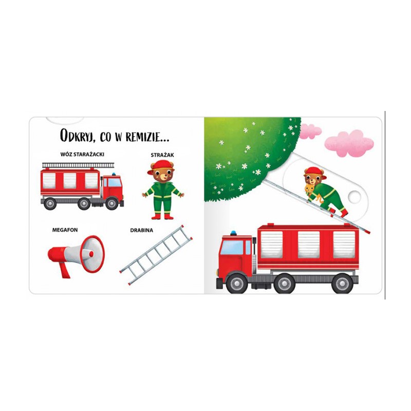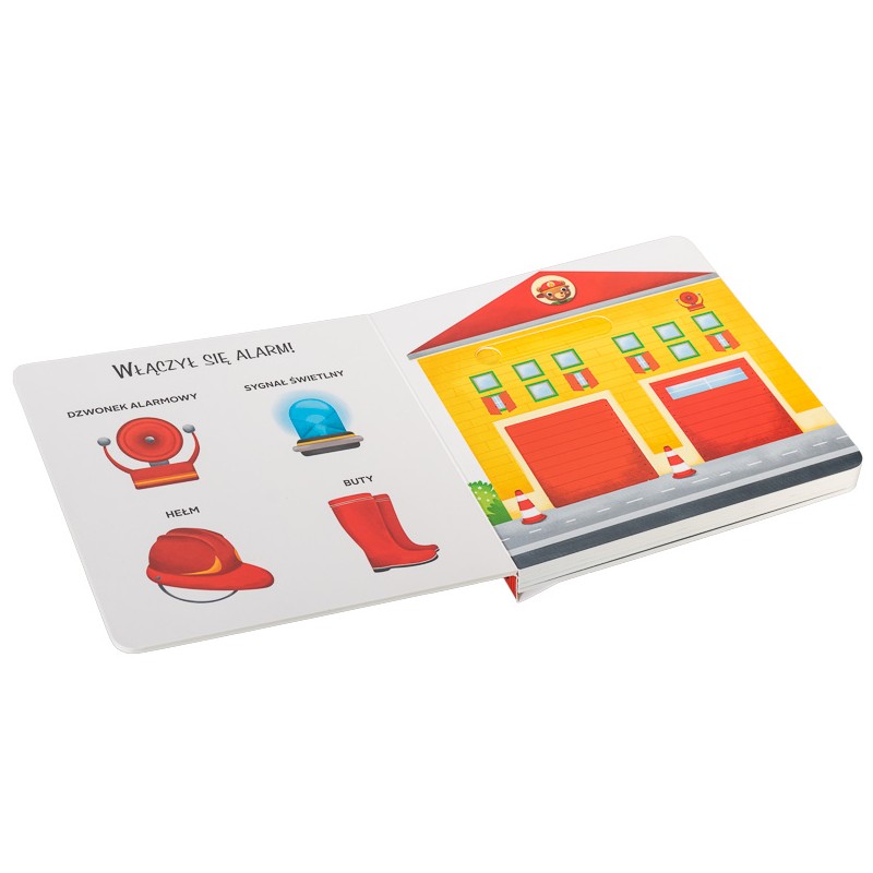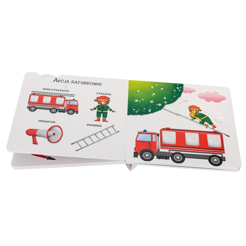 Uwagę dzieci przyciągną nie tylko piękne ilustracje, ale także liczne ruchome elementy, które zapewnią wspaniałą, pełną niespodzianek zabawę. Maluch może otwierać okienka, manipulować, przekręcać, przesuwać elementy i odkrywać to, co się pod nimi znajduje. Zabawa ze Strażakami doskonale wpłynie na rozwój motoryki i sprawności manualnej najmłodszych. Książeczka ma zaokrąglone rogi, więc jest bezpieczna dla dzieci. Zachęcamy jednak dorosłych, by wspólnie z najmłodszymi czytelnikami poznawali niespodzianki ukryte w środku. Moc atrakcji, jakie oferuje ta książka, sprawi, że maluchy będą chętnie odkrywać ją na nowo.