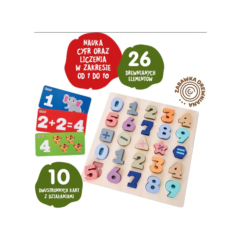 Zestaw drewnianych cyfr i dołączonych kart z ćwiczeniami zachęci dzieci do odkrywania działań arytmetycznych i poznawania podstaw matematyki, a to wszystko w formie ciekawej zabawy. Na drewnianej tabliczce znajdują się cyfry oraz znaki działań arytmetycznych, które zaznajomią malucha z kolejnymi pojęciami niezbędnymi do nauki matematyki.