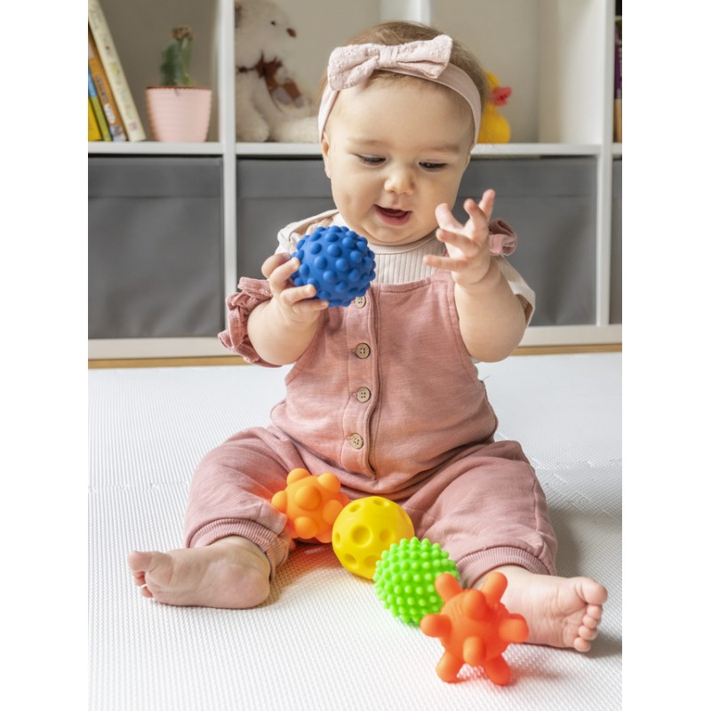 Miękkie piłeczki sensoryczne Tullo Sensorki stymulują zmysły dziecka i pomagają w jego rozwoju. Każda piłeczka posiada inną fakturę, która dostarcza różnych wrażeń czuciowych. Intensywne i wyraziste kolory pobudzają zmysł wzroku.