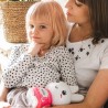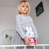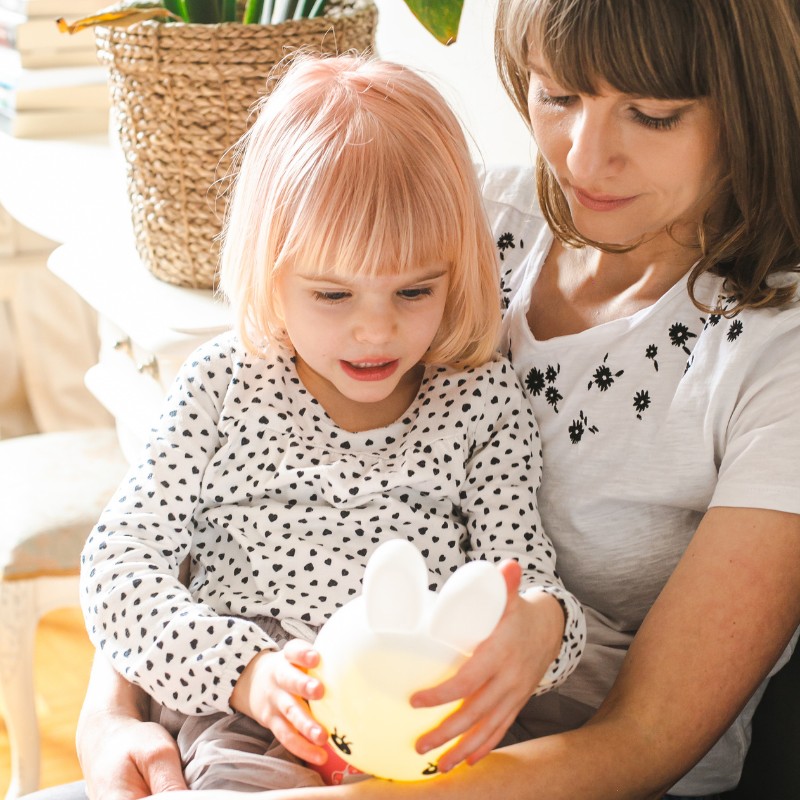 Miękkie uszy króliczka świecą delikatnym światłem zmieniającym kolory, a jego cała głowa podświetla się ciepłym światłem dodając otuchy przy zasypianiu.
