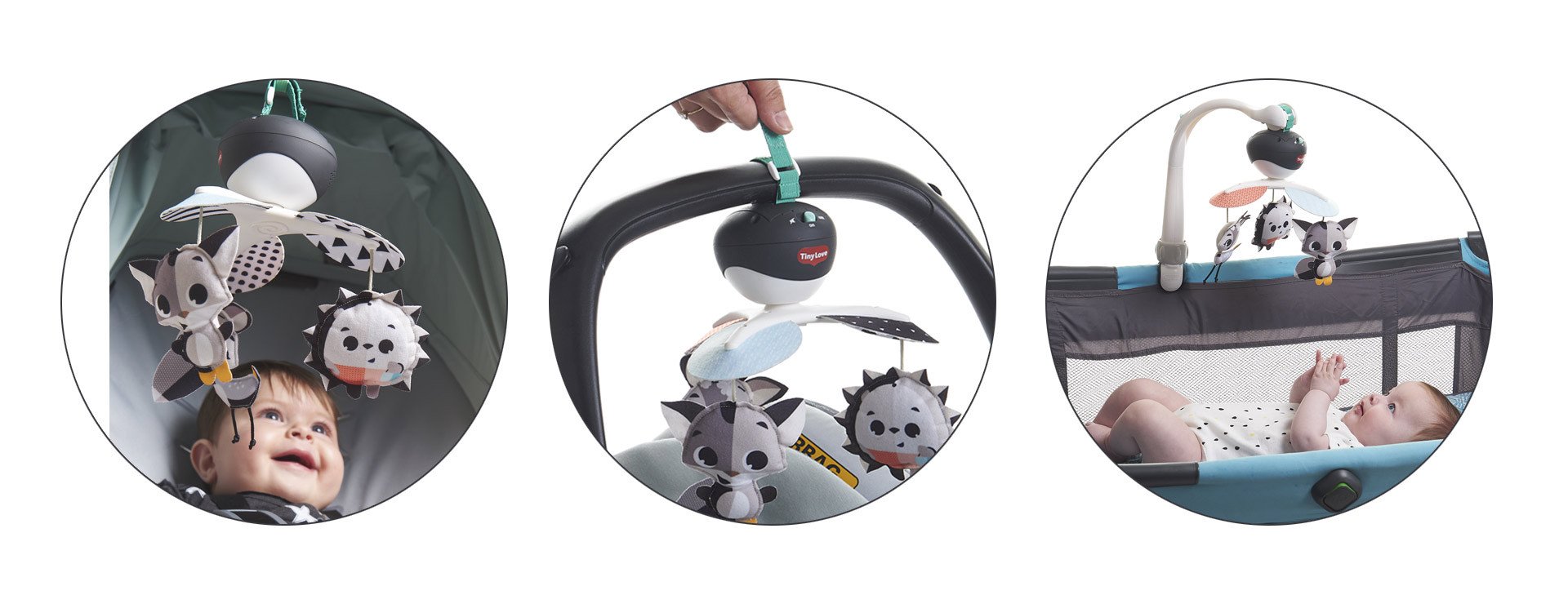 Zabawka 3w1 w podróży. Mocowanie pozwala na przymocowanie karuzeli do kojców, łóżeczek, wózków czy fotelików.