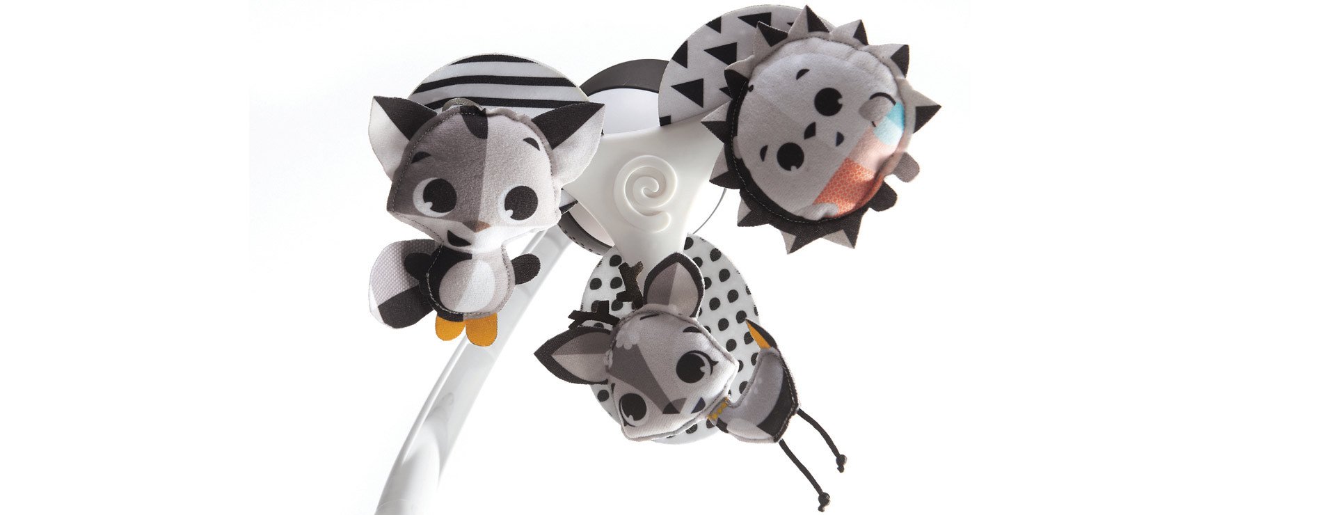 - Zmysły. Kontrastujący czarno-biały design karuzeli zapewnia idealną stymulację wzroku dla najmłodszych dzieci, których wzrok jest wciąż nierozwinięty i niewyraźny. Wyrazisty design i uśmiechnięte twarze postaci karuzeli pobudzą zmysł wzroku maluszka i zachęcą do rozwoju.