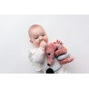 Do uszycia grzechotek użyto bezpiecznych tkanin o różnej strukturze. Dzięki temu dziecko poznaje świat i stymuluje zmysł dotyku. Nie zapominamy także o prawidłowym rozwoju zmysłu wzroku. Na samym początku nasze pociechy nie dostrzegają kolorów i nie odróżniają kształtów. Zastosowana na grzbiecie oraz uszach biało-czarna bawełna rozwija prawidłowe postrzeganie barw. Skupiając wzrok na biało-czarnych wzorach niemowlę zwiększa efektywność swojego mózgu. Dodatkowe metki, kolorowe kółeczka, grzechotka ukryta w kości, miękkie i bezpieczne dla dziecka lusterko, sprawiają, że maluch poprzez zabawę ćwiczy również małą motorykę, sprawność paluszków i koordynację ręka-oko.