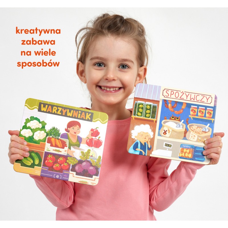 Edukacyjny zestaw zawiera 6 dużych kolorowych plansz i 36 żetonów, przedstawiających 6 różnych sklepów i smakołyki, które można w nich kupić. Do gry w loteryjkę chętnie zasiądą maluchy, starszaki i cała rodzina. CzuCzulotto sprawdzi się jako układanka, pierwsza gra dla maluchów i inspiracja do mnóstwa przeróżnych zabaw, na przykład w sklep i gotowanie. Mnóstwo pomysłów znajdziecie w poradniku, który dołączyliśmy do zestawu. Grajcie i bawcie się razem, doskonaląc przy tym przeróżne umiejętności.