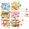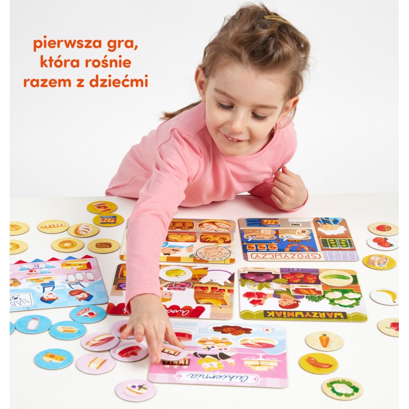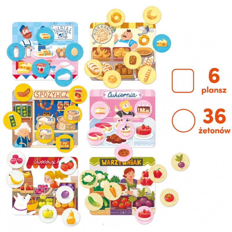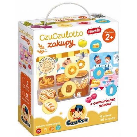 CzuCzulotto ZAKUPY to doskonała pierwsza gra dla maluchów. Zestaw zawiera 6 dużych tabliczek przedstawiających różne sklepy i stragany oraz 36 żetonów z produktami spożywczymi, które można w nich kupić.