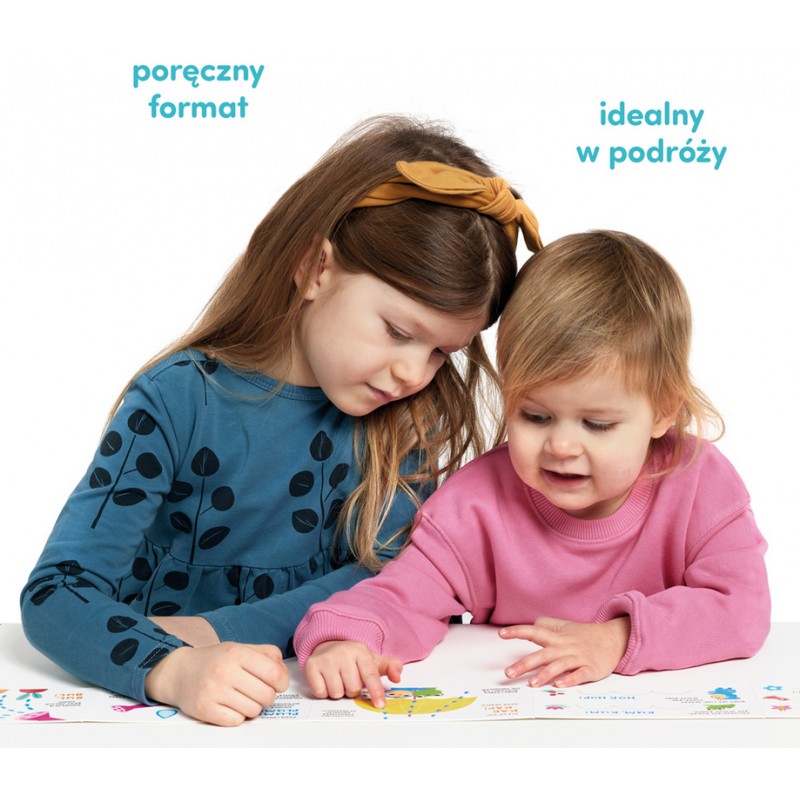 Długa książeczka harmonijka od CzuCzu pełna kolorowych ilustracji i pomysłów na wesołe zabawy dostosowane do wieku i rozwijających się umiejętności dziecka. Na każdej stronie znajdują się różnorodne paluszkowe zadania, które pozwalają doskonalić gest wskazywania palcem i wodzenie po śladzie.