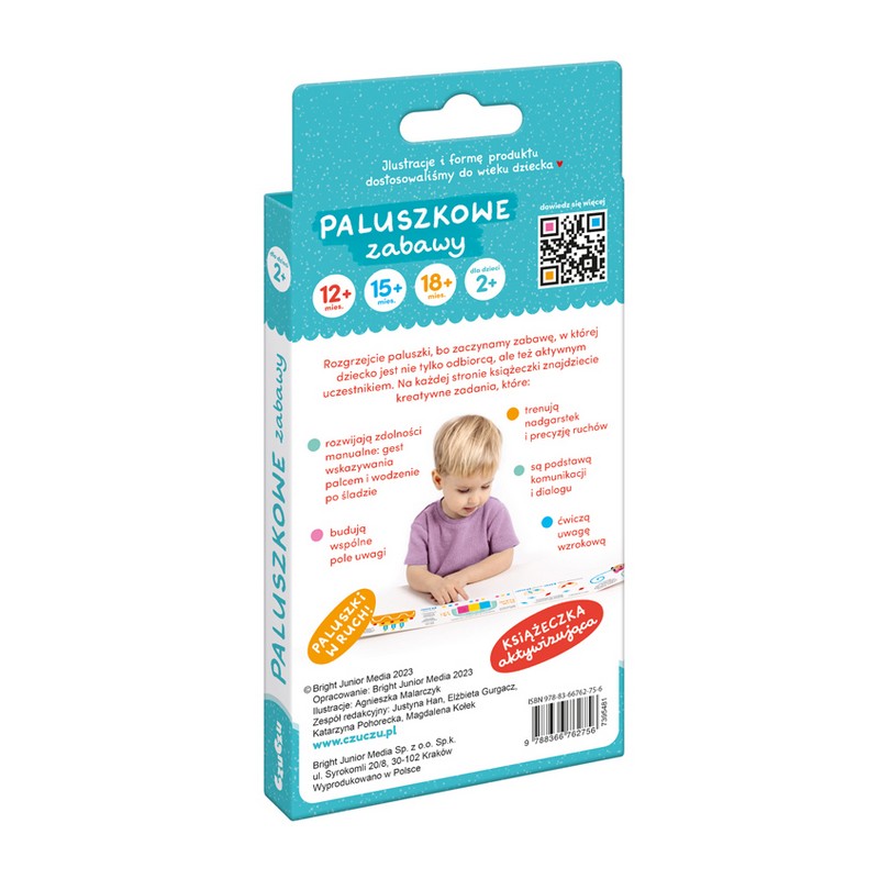 Paluszkowe zabawy CzuCzu dla dzieci 2+ to wyjątkowa książeczka aktywizująca. W tej części doskonalimy małą motorykę i doskonalimy precyzję ruchów w bardzo przyjemny i wesoły sposób.