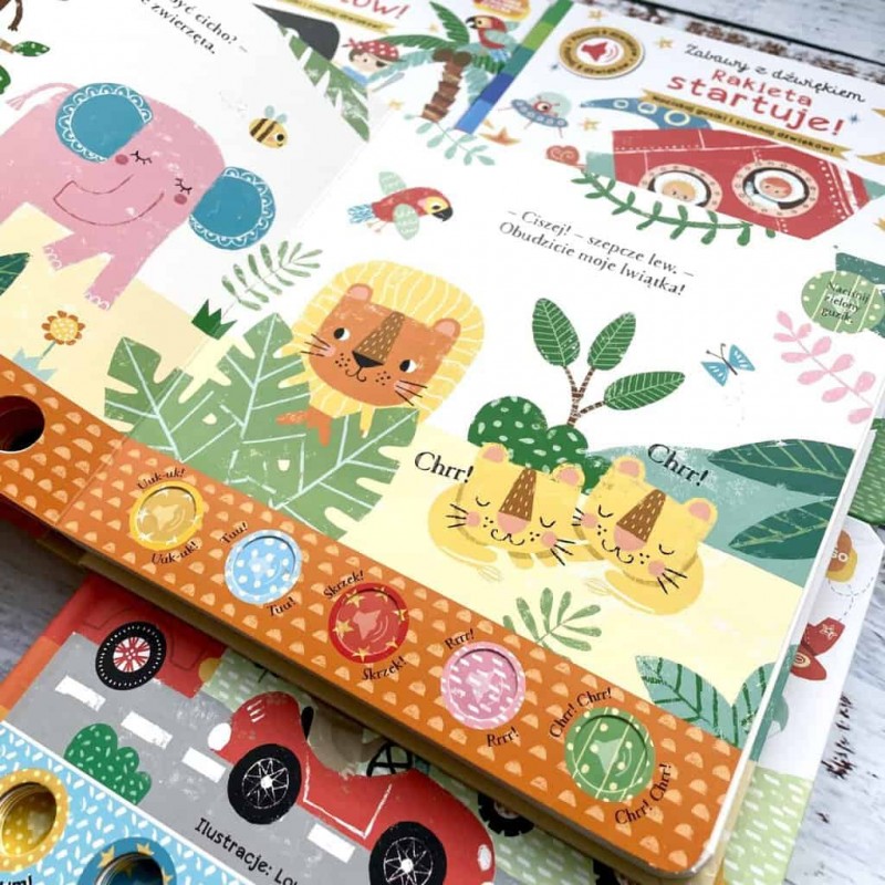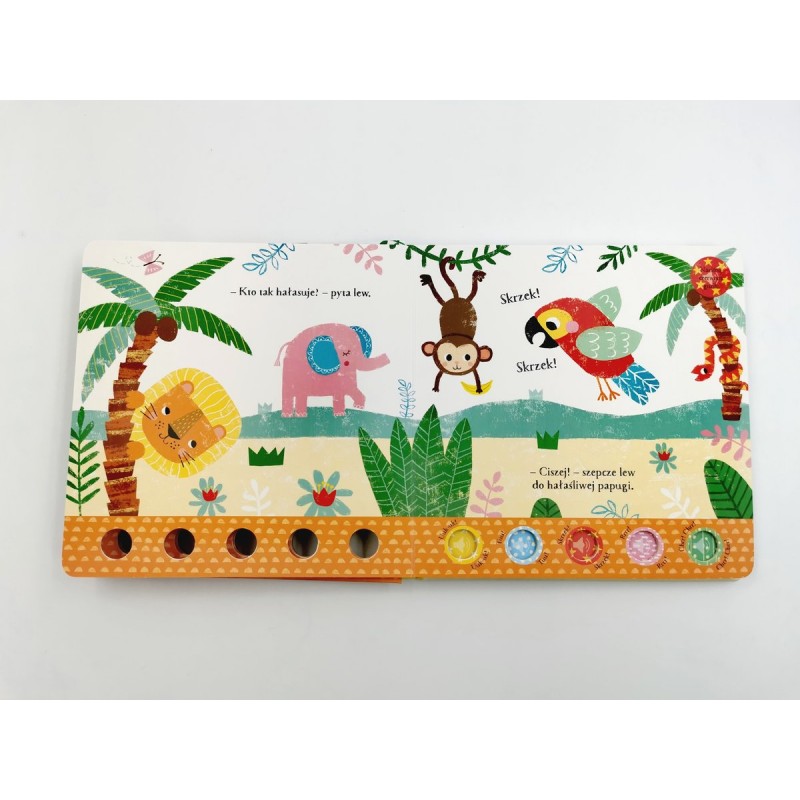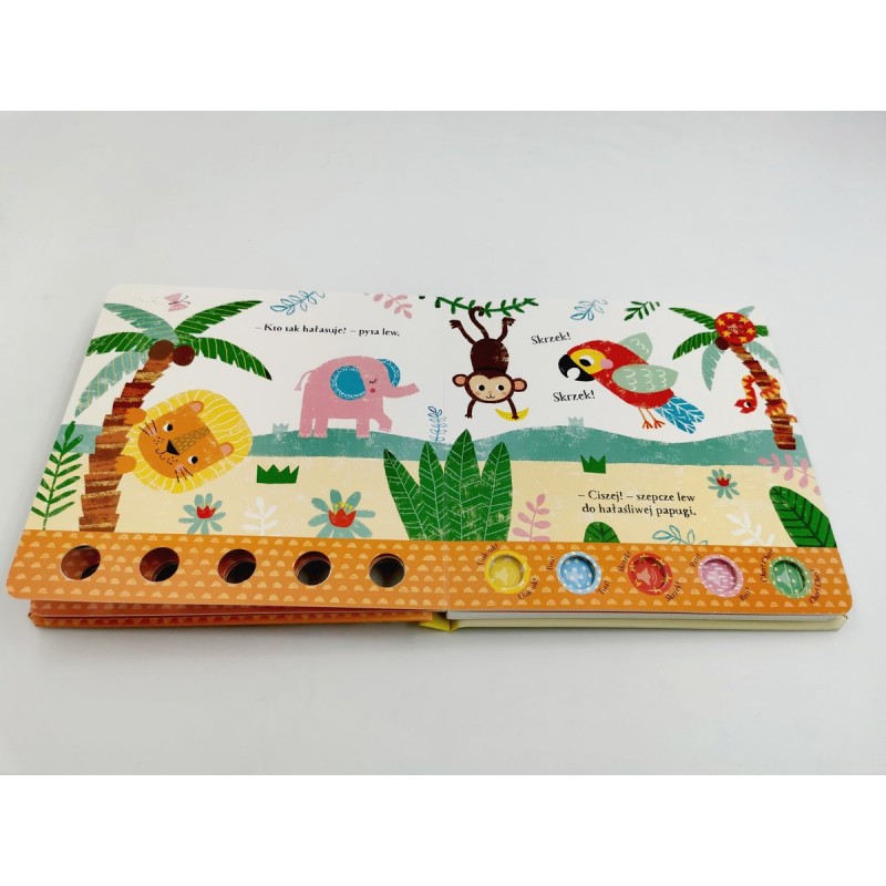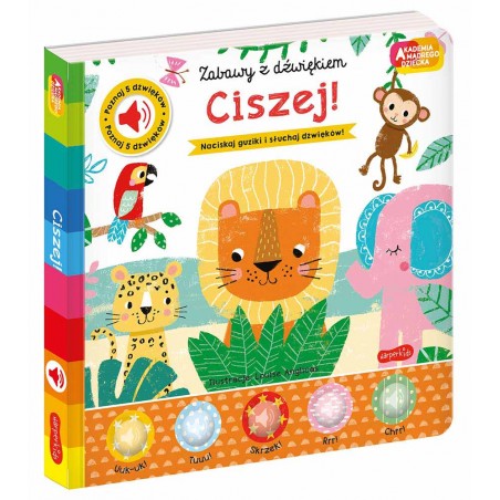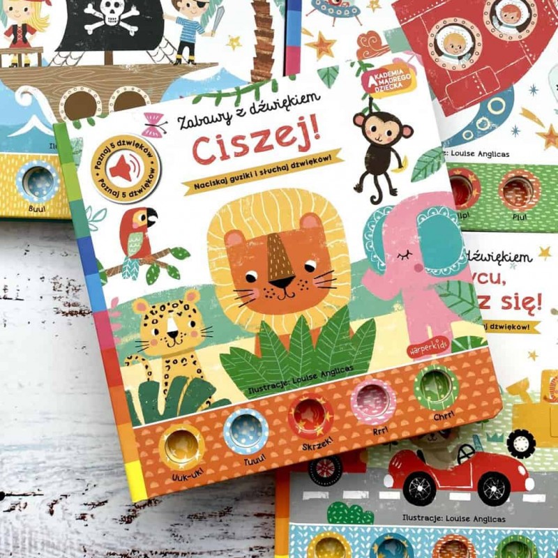 Nowością wydawniczą HaprerKids jest seria Zabawy z dźwiękiem czyli dźwiękowe książeczki dla najmłodszych. Tytuł Ciszej! Akademia mądrego dziecka opowiada o lwie, który szuka ciszy, by móc odpocząć. Prosi więc każde napotkane zwierzątko, by było cicho. I tak zwraca uwagę huśtającej się małpce, trąbiącemu słoniowi, skrzeczącej, kolorowej papudze oraz głośnemu lampartowi. Gdy zwierzątka pytają się lwa czemu wszystkie ucisza, okazuje się, że niedaleko śpią słodko małe lwiątka i tata nie chce, żeby szybko się obudziły.