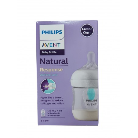 Butelka plastikowa 125ml z nakładką antykolkową AVENT Natural Response i smoczkiem, który działa jak pierś Mamy. Buteleczka jest poręcza, umożliwia chwytanie przez małe rączki, jak również łatwa w utrzymaniu w czystości. Smoczek szeroki, miękki, elastyczny, zaprojektowany tak, aby ułatwić łączenie karmienia piersią i butelką oraz wspierać naturalny rytm ssania małego dziecka. Wyposażony także w zaworki antykolkowe, które regulują w nich ilość powietrza. Wentylek AirFree umieszczony butelce ułatwia karmienie w pozycji pionowej, jak również jest dodatkową ochroną przeciwko kolce, gazom i refluksowi.