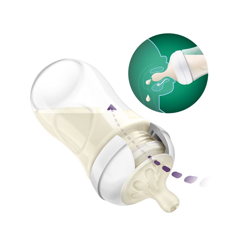 Innowacyjna konstrukcja Responsywnego smoczka Natural - rozcięcie J slit umożliwia dziecku samodzielnie kontrolować tempo i rytm ssania. Mleko uwalniane jest tylko wtedy, gdy dziecko aktywnie ssie. Gdy dziecko przestaje ssać, aby przełknąć lub odetchnąć, mleko również przestaje płynąć
