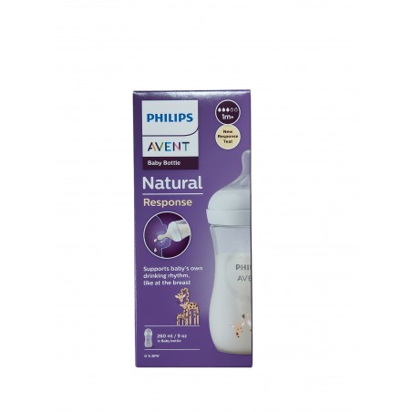 Butelka 260ml AVENT Natural Response ŻYRAFKA ze smoczkiem, który działa jak pierś Mamy. Poręczna, umożliwia chwytanie przez małe rączki dziecka, jak również łatwa w utrzymaniu w czystości. Smoczek szeroki, miękki, elastyczny, zaprojektowany tak, aby ułatwić łączenie karmienia piersią i butelką oraz wspierać naturalny rytm ssania małego dziecka. Wyposażony jest w zaworek antykolkowy, który reguluje w nim ilość powietrza. Tego typu rozwiązanie ogranicza kolkę oraz dyskomfort po jedzeniu.
