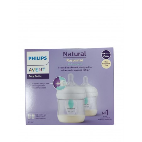 Zestaw plastikowych butelek 2x125ml z nakładką antykolkową AVENT Natural Response i smoczkami, które działają jak pierś Mamy. Buteleczki są poręczne, umożliwiają chwytanie przez małe rączki, jak również łatwe w utrzymaniu w czystości. Smoczki szerokie, miękkie, elastyczne, zaprojektowane tak, aby ułatwić łączenie karmienia piersią i butelką oraz wspierać naturalny rytm ssania małego dziecka. Wyposażone także są w zaworki antykolkowe, które regulują w nich ilość powietrza. Wentylek AirFree umieszczony w każdej butelce ułatwia karmienie w pozycji pionowej, jak również jest dodatkową ochroną przeciwko kolce, gazom i refluksowi.