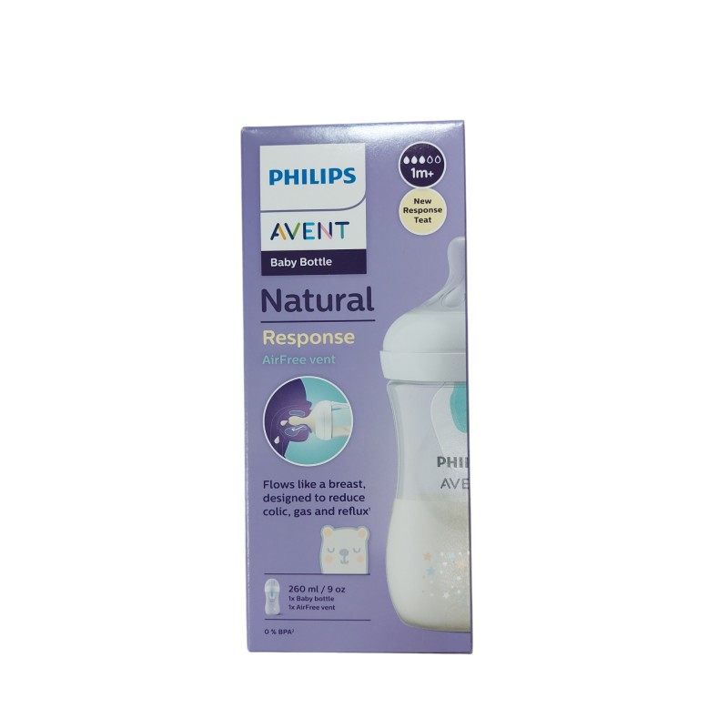 Szeroki, miękki i elastyczny smoczek w butelce Natural Response naśladuje kształtem i fakturą kobiecą pierś, co pozwala dziecku przyssać się i spokojnie pić. Smoczek wyposażony jest w zaworek antykolkowy, który utrzymuje powietrze z dala od brzuszka dziecka. Ogranicza to kolkę i dyskomfort. Nakładka antykolkowa AirFree zapobiega przedostawaniu się powietrza do małego brzuszka w trakcie karmienia w ułożeniu pionowym. Wypełniając smoczek mlekiem a nie powietrzem, ogranicza ilość połykanego powietrza i zapewnia dodatkową ochronę przed problemami związanymi z karmieniem.