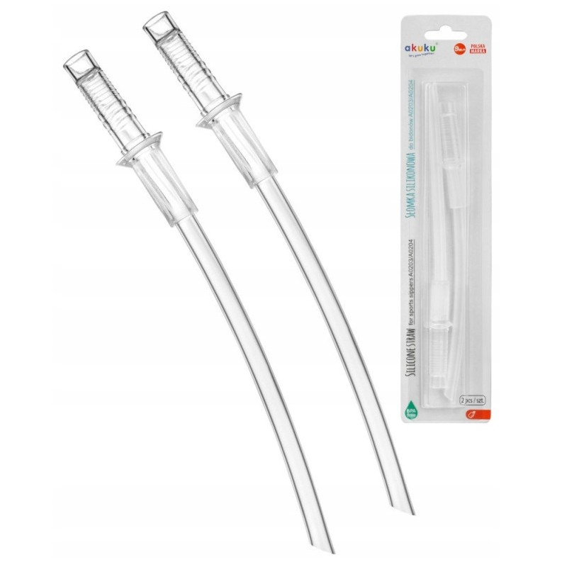 Zestaw 2 wymiennych silikonowych słomek do bidonów „akuku” o numerze katalogowym A0203 i A0204.