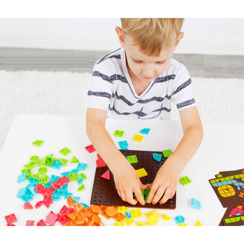 Mozaika Tabliczka Kolorowych Figur to magiczna zabawa edukacyjna dla dzieci w wieku przedszkolnym, która kształtuje wyobraźnię i kreatywność. Do dyspozycji jest plansza z mnóstwem otworów oraz kolorowymi figurami. Twórz wiele kombinacji, wyjmij elementy i zacznij od nowa. Poprzez zabawę geometryczną tabliczką dzieci szybko opanują i utrwalą proste zagadnienia, dzięki którym w przyszłości będą w stanie pojąć i zrozumieć matematykę. Dziecko może układać i odwzorowywać obrazki bądź realizować własne pomysły.