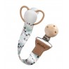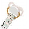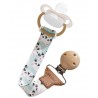Tasiemka do smoczków uspokajających to ciekawy i stylowy dodatek do smoczka i ubranka dziecka, który spełnia przede wszystkim rolę ochronną, ponieważ zabezpiecza smoczek przed zgubieniem oraz upadkiem na ziemię i zabrudzeniem. Sprawdzi się zarówno w domu, jak podczas spacerów czy w podróży. Jest specjalnie przystosowana pod kątem bezpieczeństwa dziecka. Zawieszka wykonana została z trwałej tasiemki. Posiada odpowiednie zapięcie wykonane w postaci drewnianego klipsa. Łatwe i szybkie mocowanie. Stanowi także unikalną ozdobę ubranka dziecka. Smoczek zawsze pozostaje w zasięgu ręki. Pasuje do każdego smoczka z uchwytem i bez uchwytu. Dobrze się trzyma ubranka i nie powoduje uszkodzenia materiału.