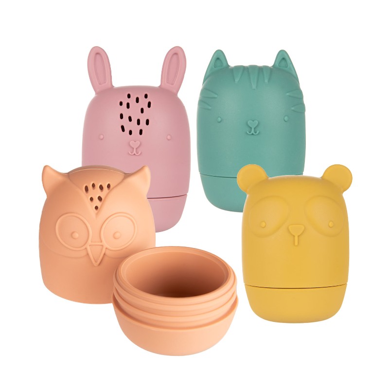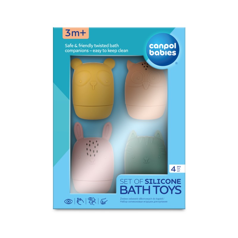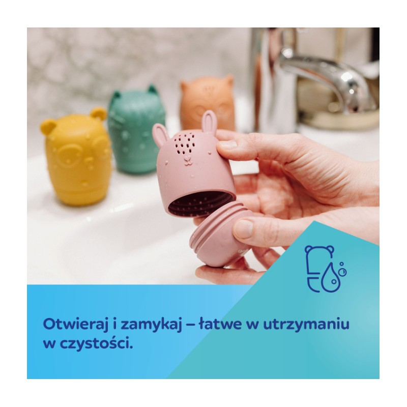 Zestaw 4 uroczych zabawek do kąpieli o różnorodnych kolorach i fakturach umilą czas podczas każdej kąpieli. Otwierana konstrukcja zabawek pozwala na dokładne umycie i osuszenie zabawek w środku, zapobiegając zbieraniu się brudu i powstawaniu pleśni. Jest to wygodne i bardzo higieniczne rozwiązanie, stworzone z myślą o zdrowiu i bezpieczeństwie dzieci. Zestaw zabawek do kąpieli wzbudza zainteresowanie u dziecka i uczy kreatywnego myślenia, dzięki wielu możliwościom zabawy. Zabawki można otwierać i dowolnie łączyć górne i dolne części, dzięki czemu rozwijają wyobraźnię i kreatywność dziecka. Napełnione wodą po naciśnięciu pryskają wodą – ćwiczą celność i sprawiają dużo radości. Zabawki do kąpieli Canpol babies są 2w1 – wykonane z miękkiego silikonu bez BPA mogą być używane jako gryzaki dla dzieci. Zabawki do kąpieli Canpol babies mają kształt dopasowany do dziecięcych dłoni, umożliwiając dziecku łatwe chwytanie i bezpieczną zabawę wspierającą jego rozwój.
