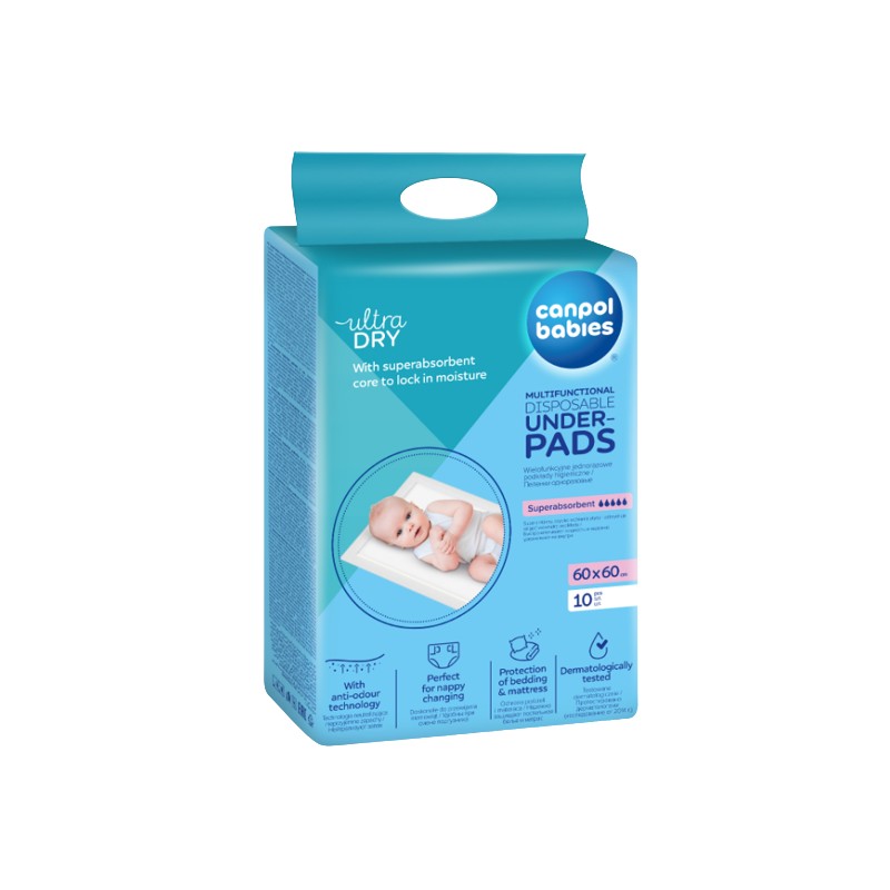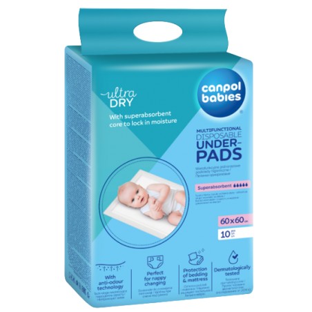 Wielofunkcyjne podkłady higieniczne Canpol babies z wodoodporną warstwą ochronną na spodzie podkładu doskonale sprawdzają się w wielu sytuacjach. Superchłonny wkład szybko wchłania płyny i zatrzymuje wilgoć wewnątrz podkładu. Podkłady higieniczne są niezbędne dla kobiet w okresie połogu.