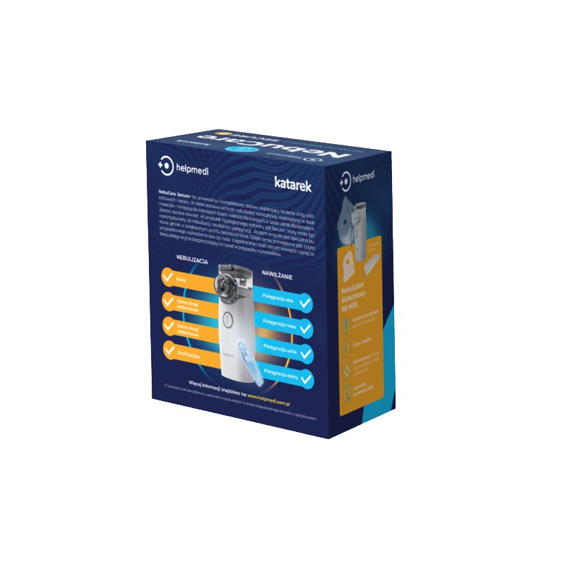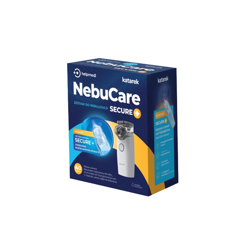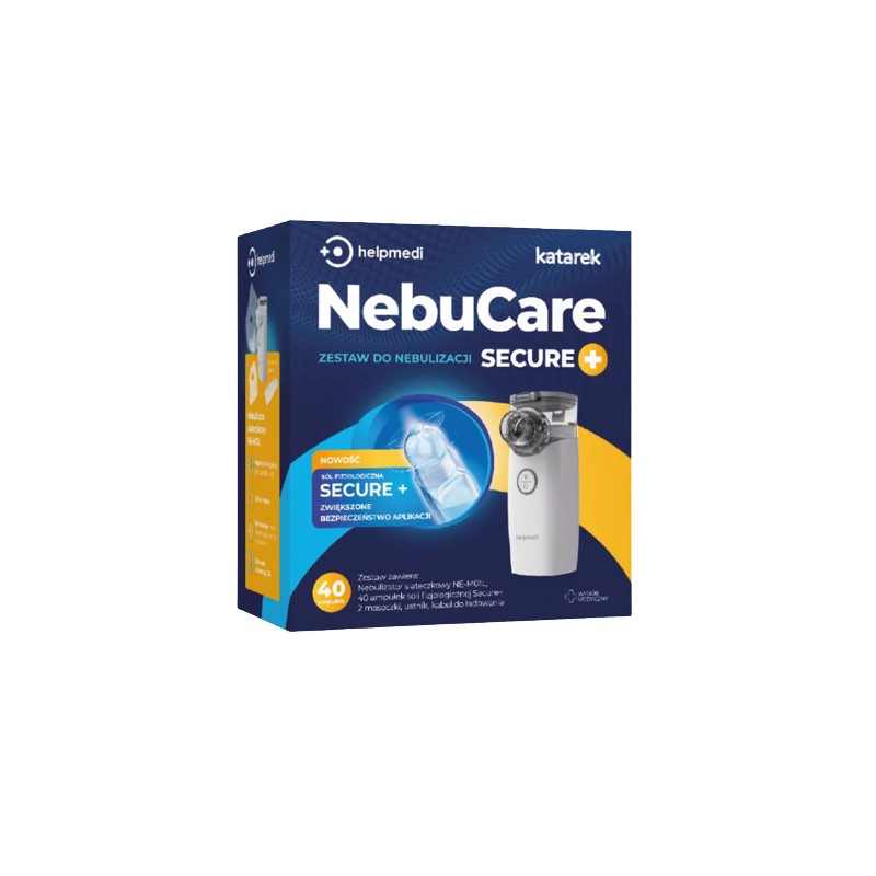 NebuCare Secure+ przeznaczony jest do nebulizacji dzieci podczas leczenia różnych schorzeń dróg oddechowych. W skład zestawu wchodzi nebulizator siateczkowy z zestawem dwóch maseczek i ustnika, oraz 40 ampułek roztworu soli fizjologicznej Katarek Secure+ w innowacyjnych ampułkach z okrągłym zakończeniem zapewniającym wyższy poziom bezpieczeństwa, co zmniejsza ryzyko urazów.